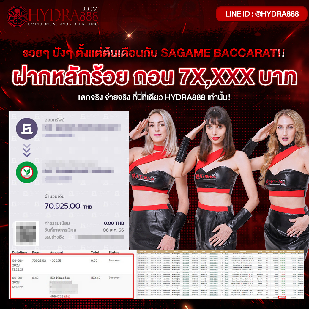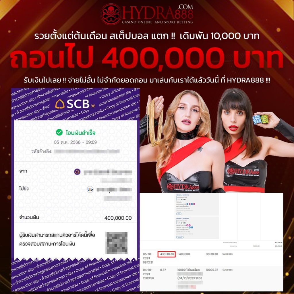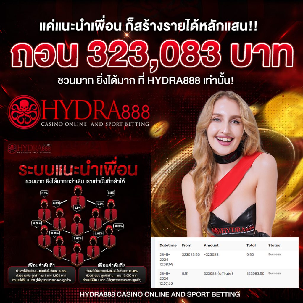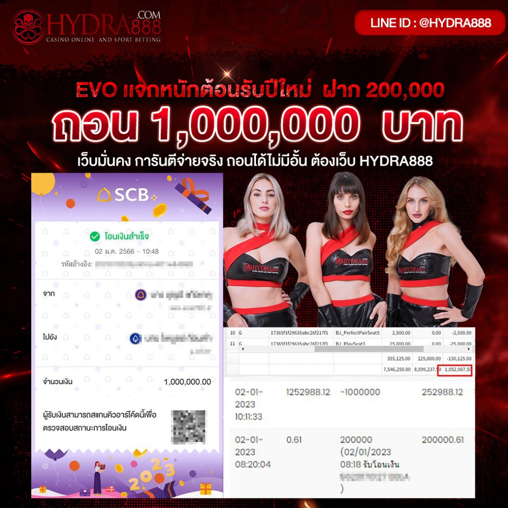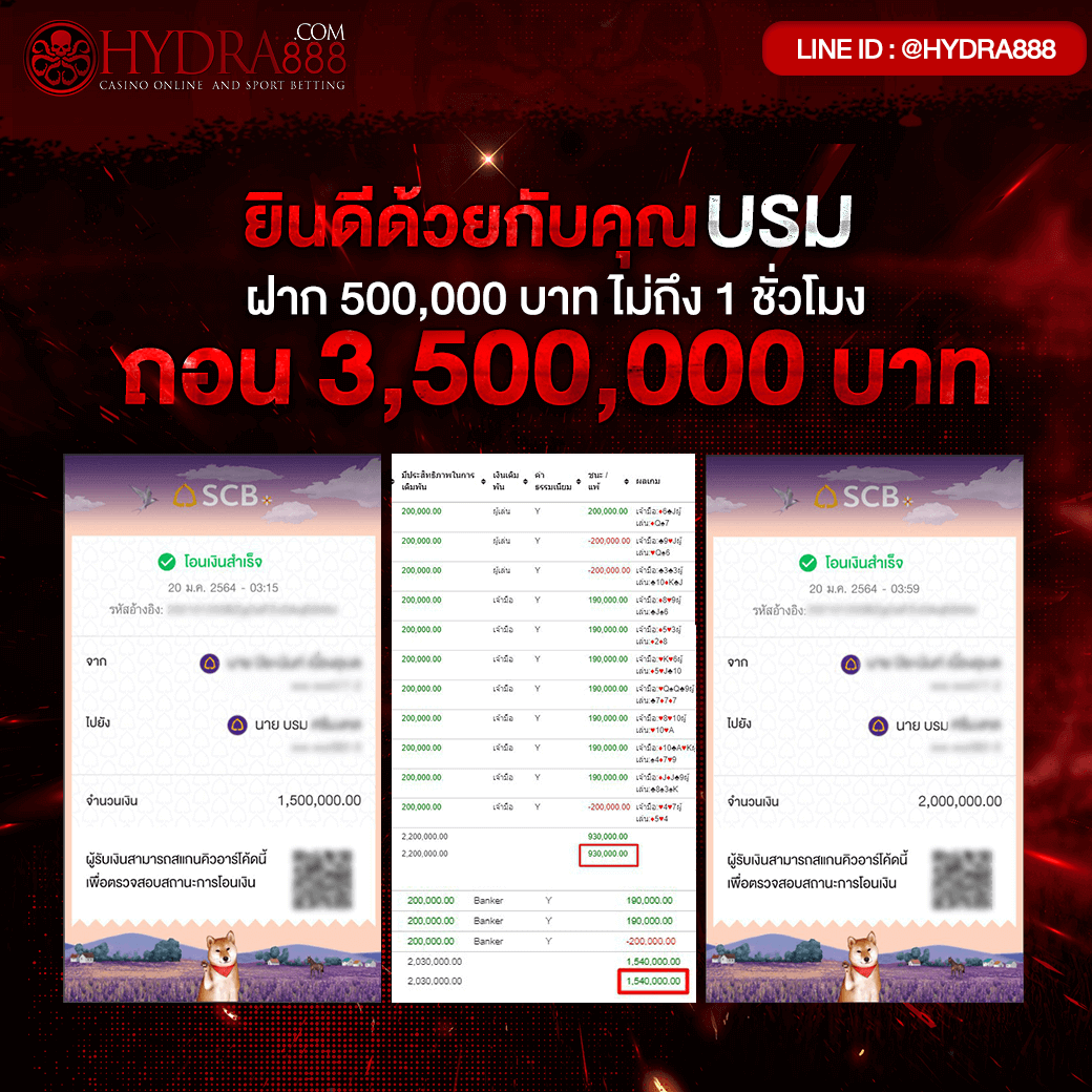 ยินดีต้อนรับลูกค้าทุกท่าน ด้วยความมั่นคงของเว็บ HYDRA888 การันตียอดถอน ไม่ว่าจะทุนน้อยทุนมาก ก็กลายเป็นเศรษฐีเงินล้านได้ ด้วยระบบฝาก-ถอน อัตโนมัติ ลูกค้าสามารถทำรายการเองได้ที่หน้าเว็บ ไม่ต้องรอแอดมินทำรายการ ไม่ว่าจะยอด แสน ยอดล้าน กี่ล้านเราก็จ่าย ยืนยันด้วยภาพโปรโมท หลักฐานการโอนจริง ได้จริง รวยจริง ที่ HYDRA888.COM